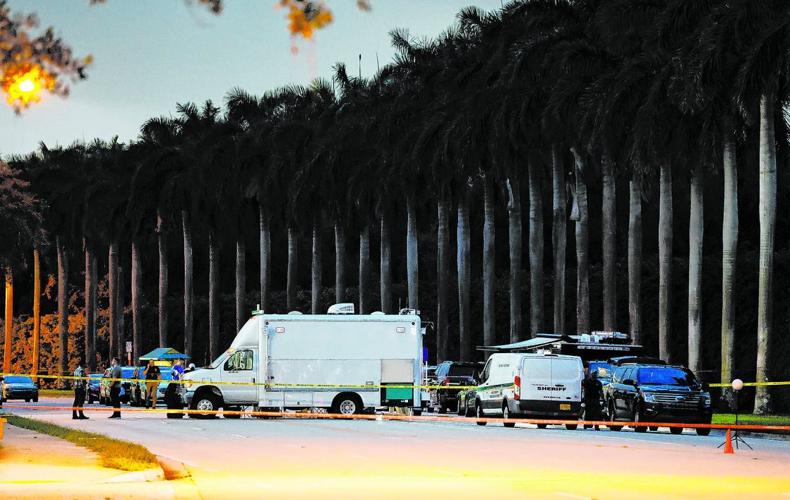 Police crime scene vehicles are seen at Trump International Golf Club in West Palm Beach, Fla., on Sunday evening after what was said to be a failed second assassination attempt on Republican presidential nominee and former President Donald Trump
