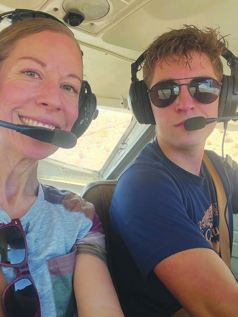 Talon Newsom is at the controls of a small aircraft with his mom and first passenger, Becca Newsom, at left. Talon Newsom, 19, is the first member of UNR-Extension’s 4-H Youth Aviation Club to earn a private pilot’s license.